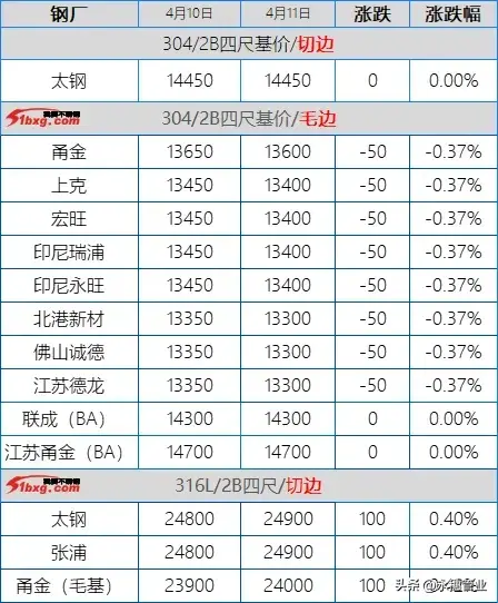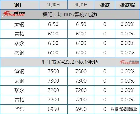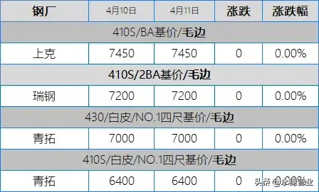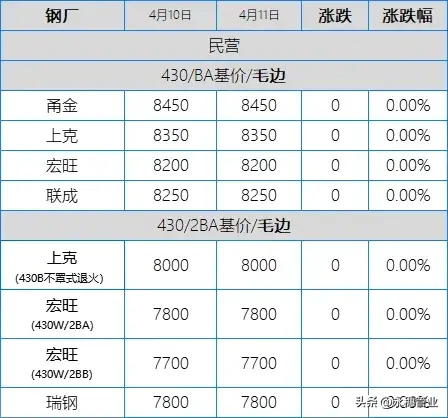 目前市場主流報(bào)價(jià):410S熱軋黑皮在6100-6150元/噸,個(gè)別在6200元/噸左右;430熱軋黑皮在6700-6800元/噸;太鋼/酒鋼430/2B(毛)在8000-8100元/噸;聯(lián)眾430/2BA(毛)在7800-7900元/噸;宏旺430/2BA(毛)在7800-7850元/噸;甬金430/BA(毛)在8450元/噸左右;上克430/BA(毛)在8350元/噸左右;宏旺430/BA(毛)在8200-8250元/噸;瑞鋼430/2BA(毛)在7800元/噸左右;聯(lián)成430/BA(毛)在8250元/噸左右。