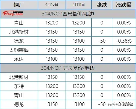 今日,青山代理報(bào)價(jià)4-5月期貨,鼎信304冷軋窄帶13200元/噸,30478冷軋窄帶12700元/噸,304熱軋大板13230元/噸。
